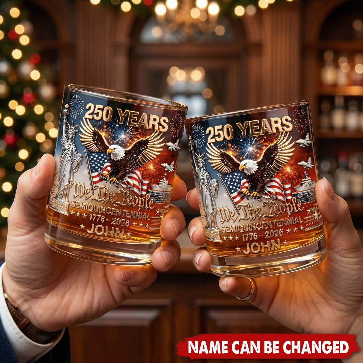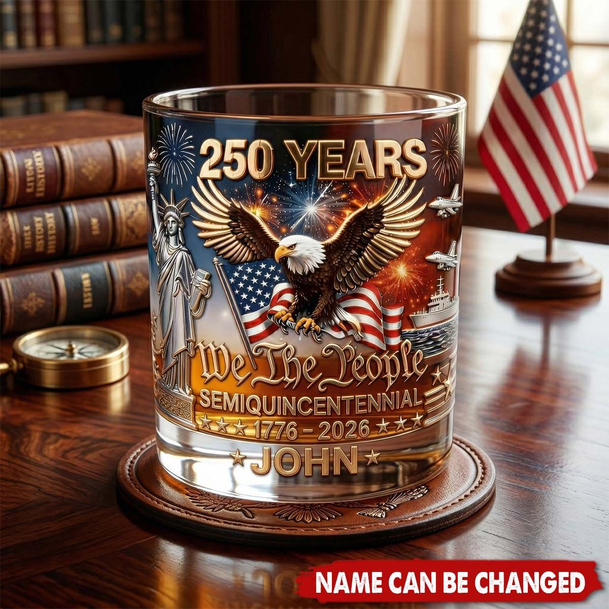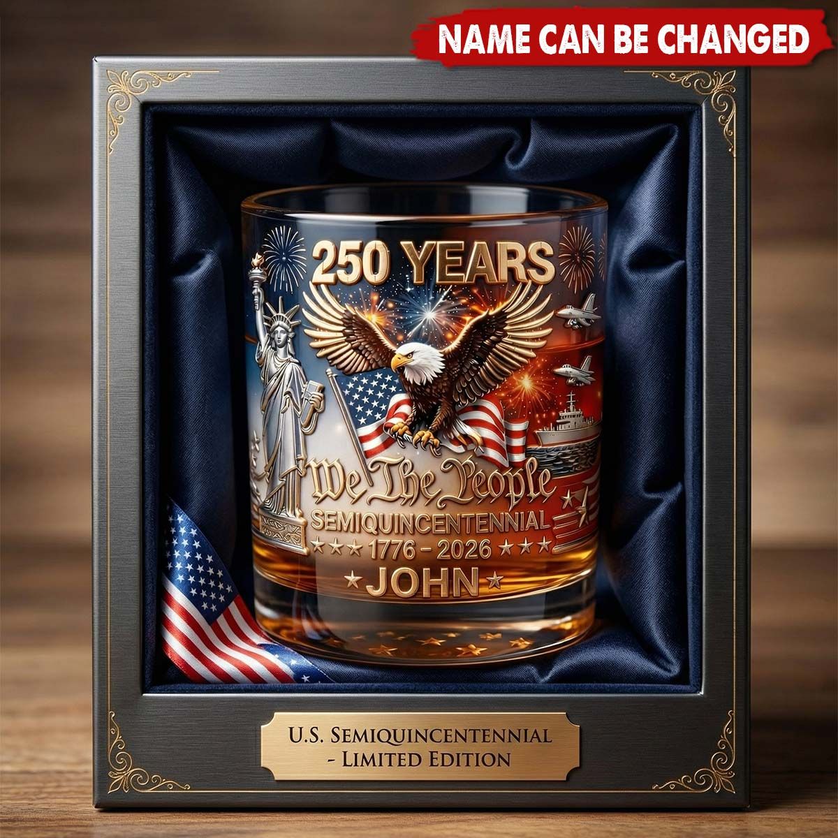 Raise a glass to 250 years of freedom—engraved with your name, for the patriot who pours pride in every sip. Here's to the story still being written.