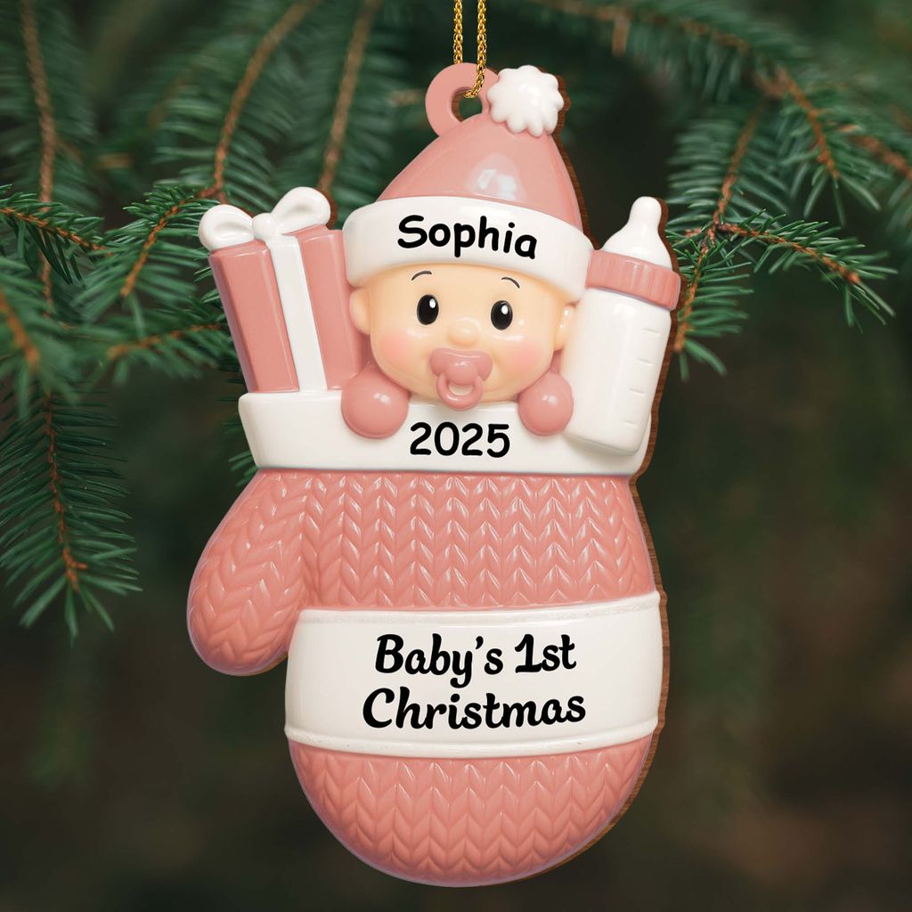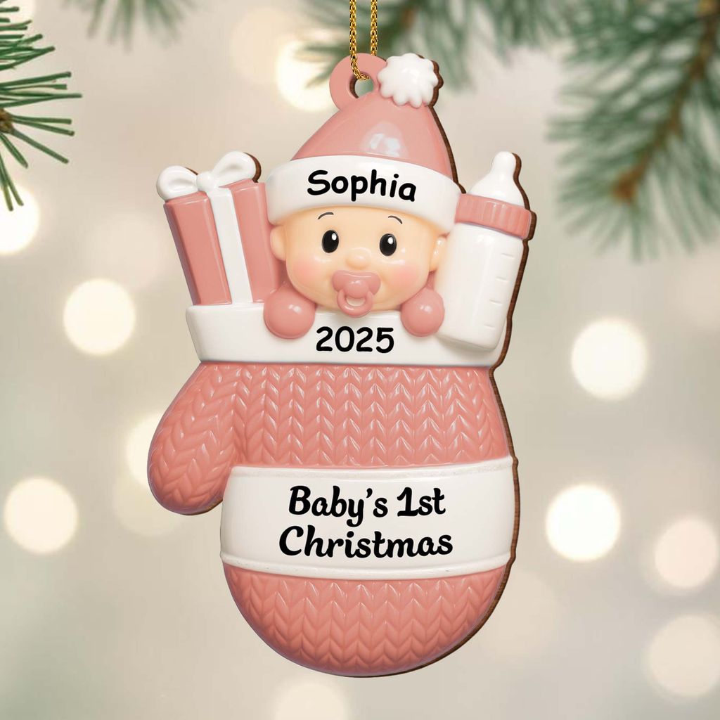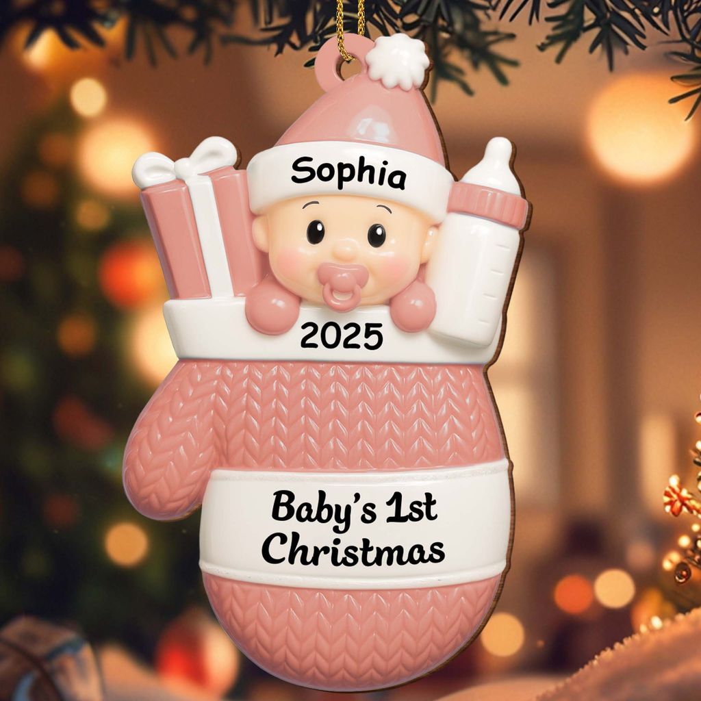 Baby's first Christmas, baby with gifts and bottle - Personalized acrylic decoration
