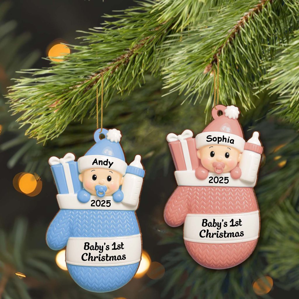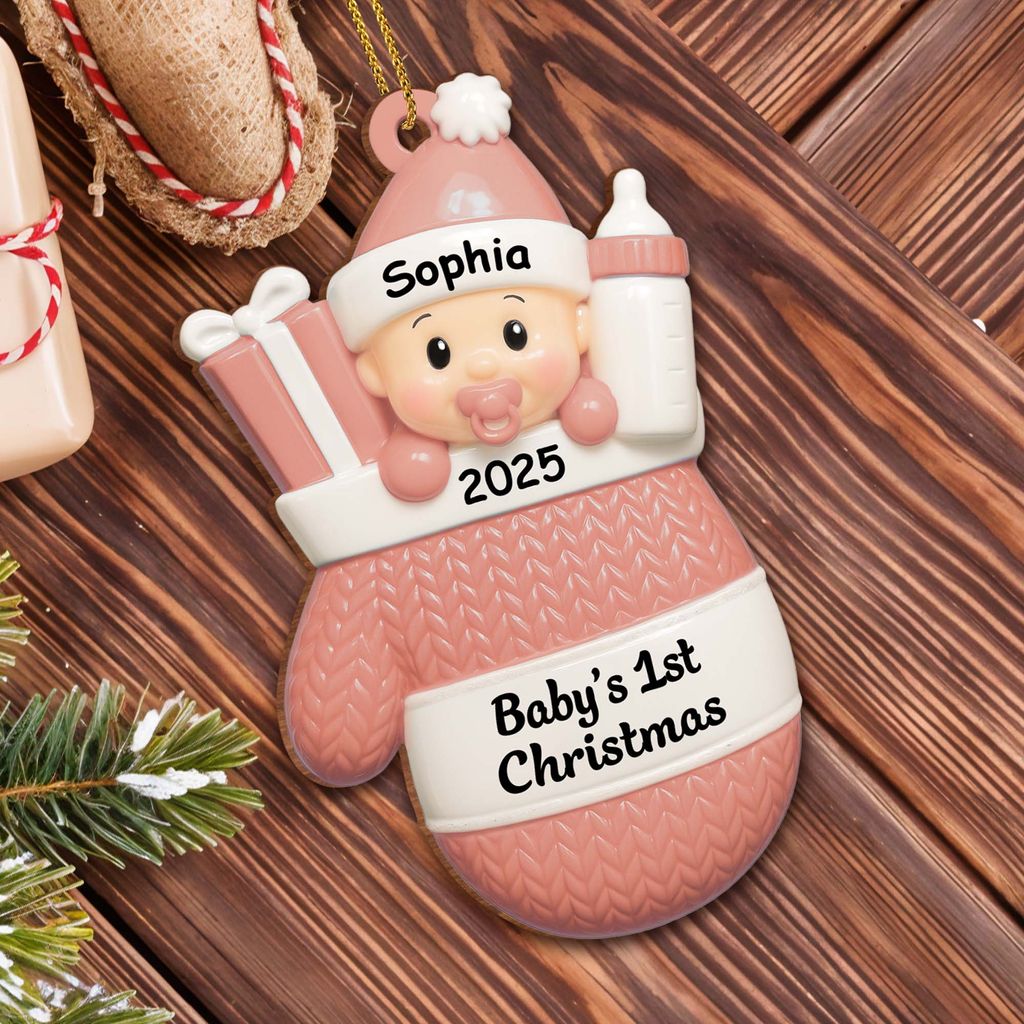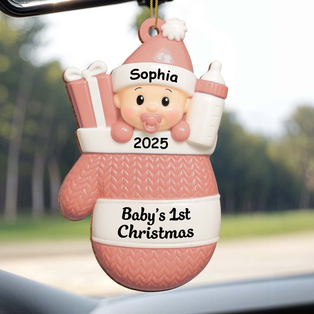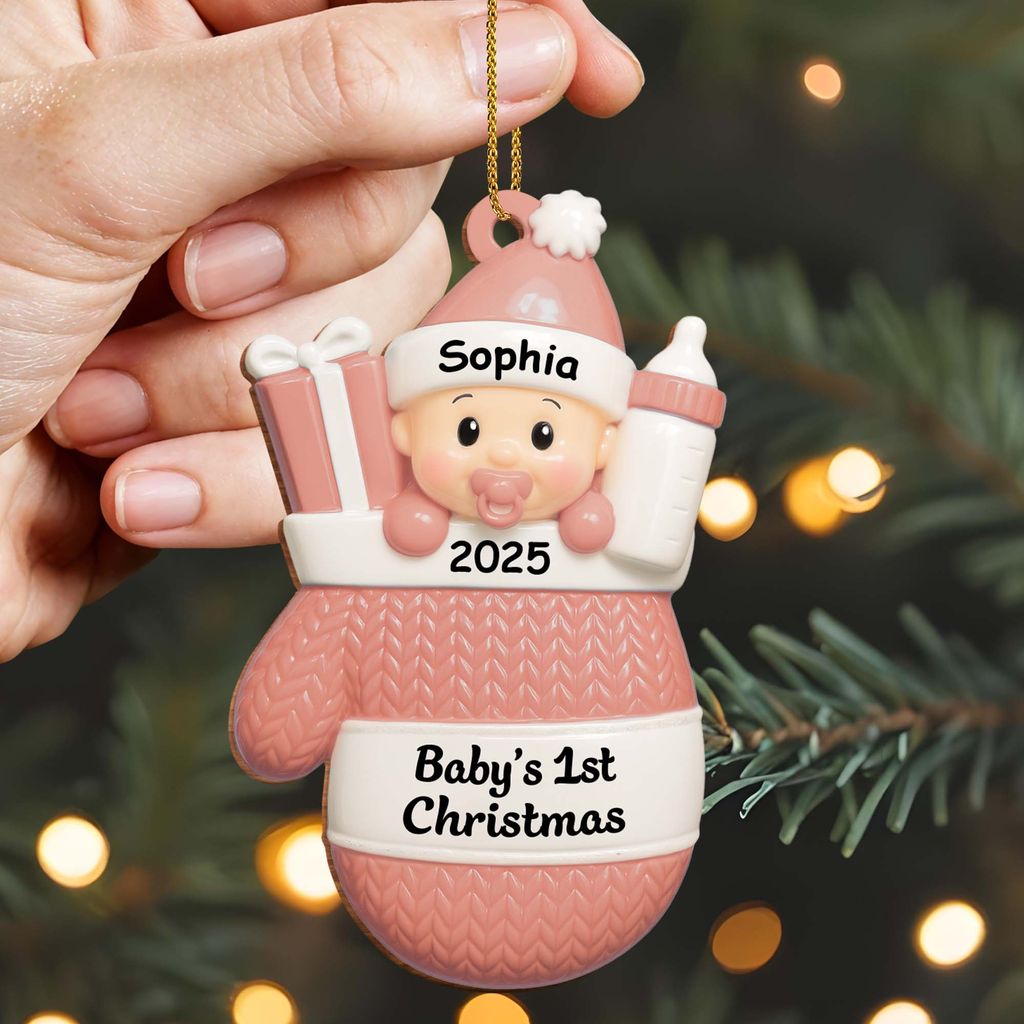 Baby's first Christmas, baby with gifts and bottle - Personalized acrylic decoration