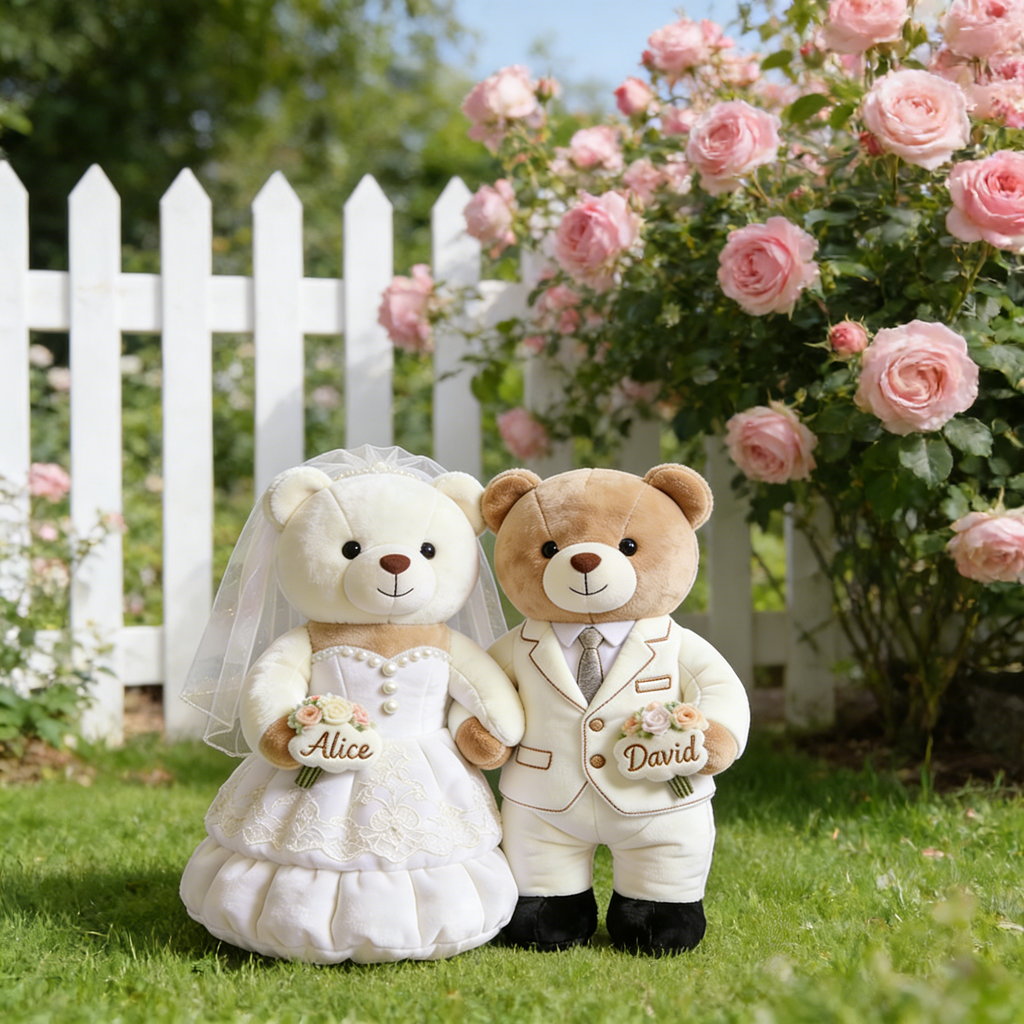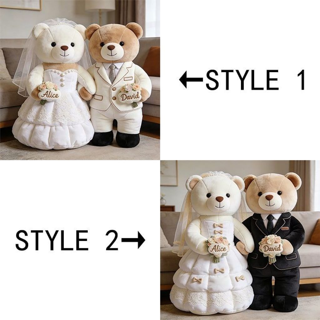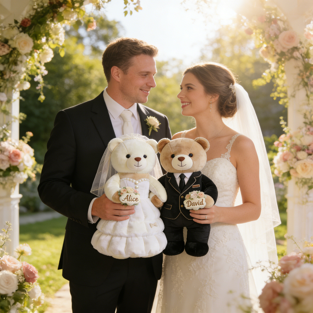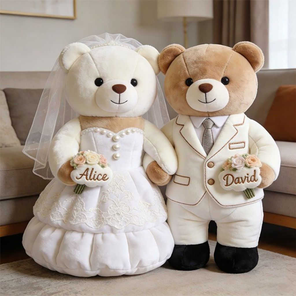 Celebrate new beginnings with the sweetest keep's ake of love. OurPersonalized Newlywed Bear Throw PillowCaptures the pure joy and tender romance of your wedding day, transformed into an adorable, huggable work of art. Inspired by a charming bear couple dressed in a delicate wedding gown and a dapper suit, this pillow freezes that magical “just married” moment in a soft, three-dimensional sculpture you can hold close.