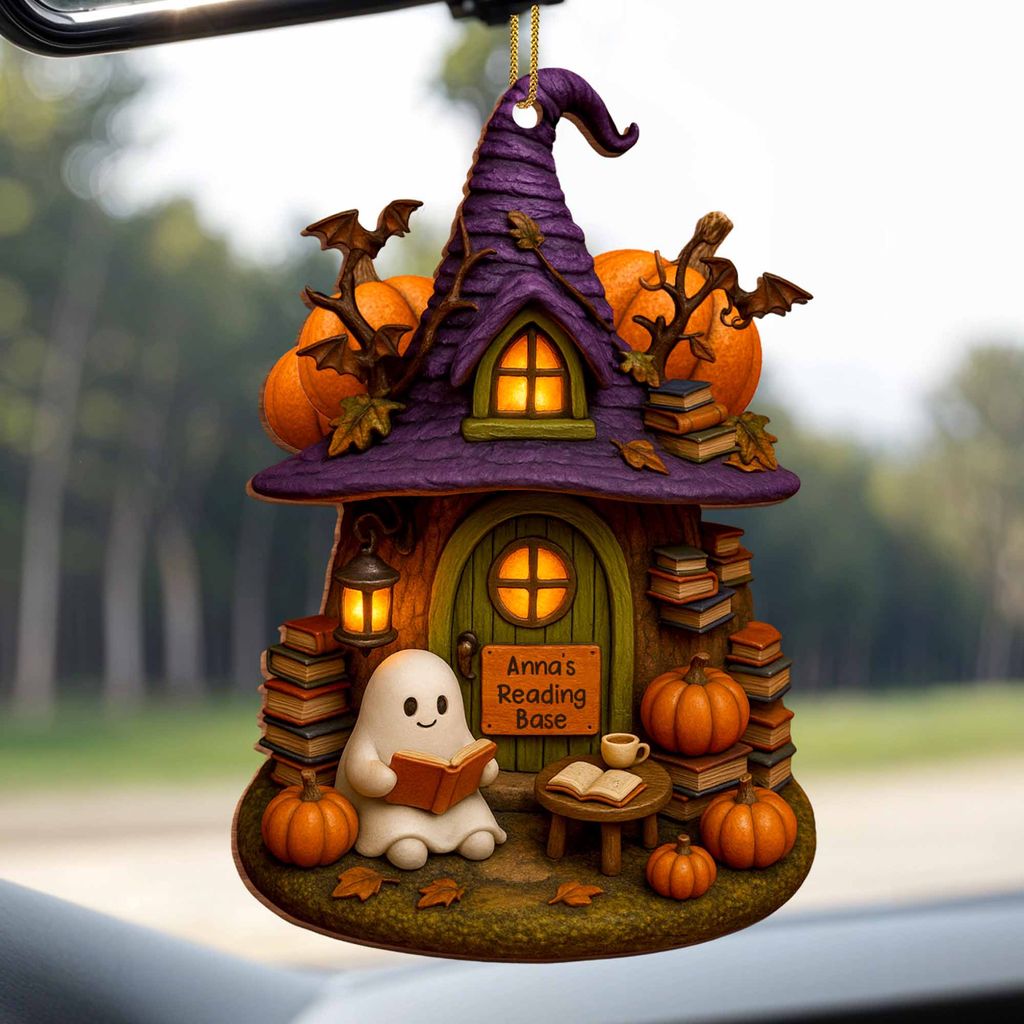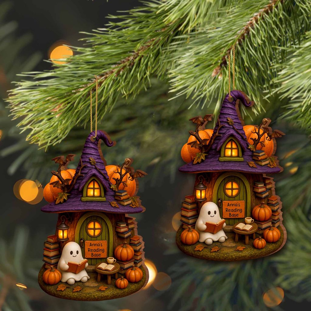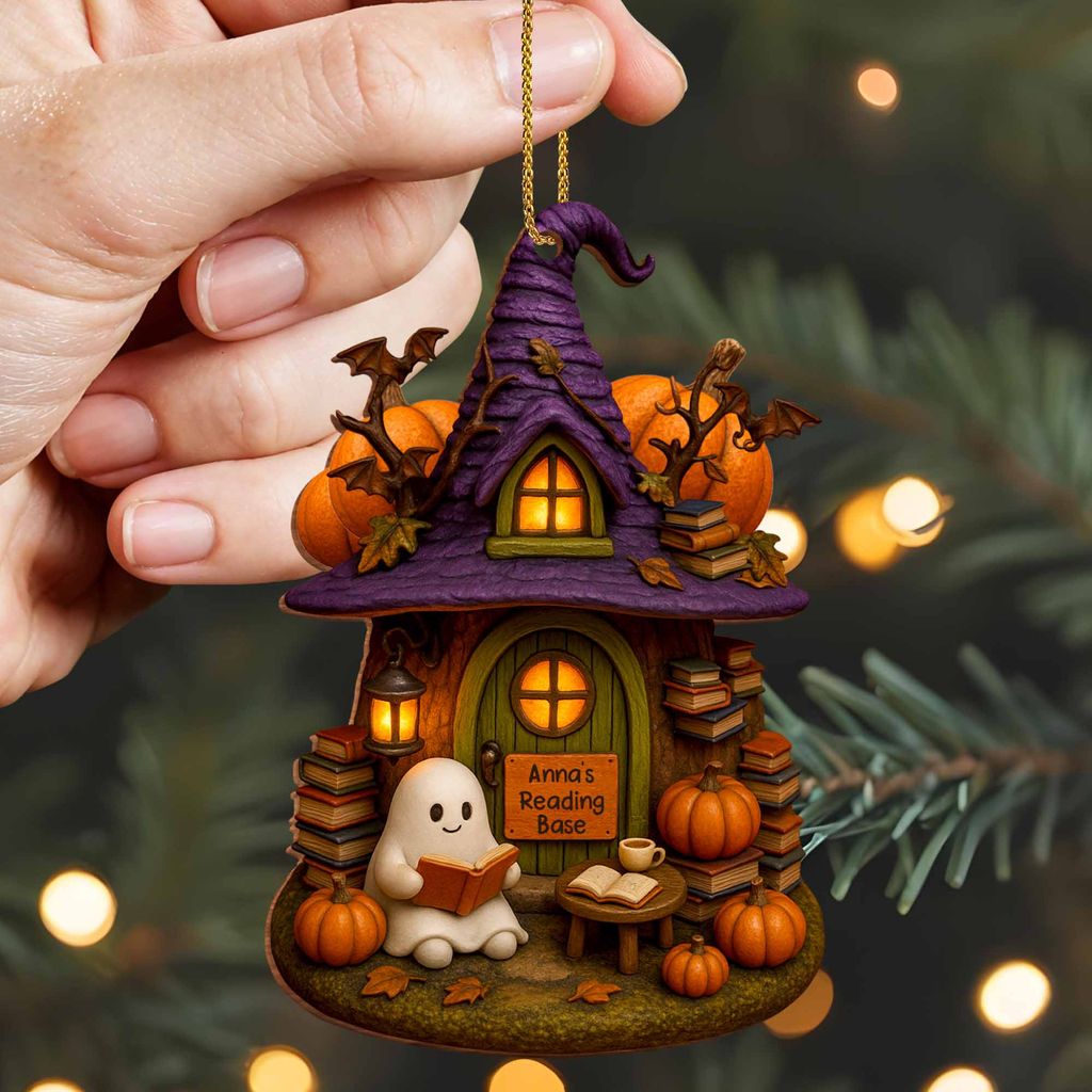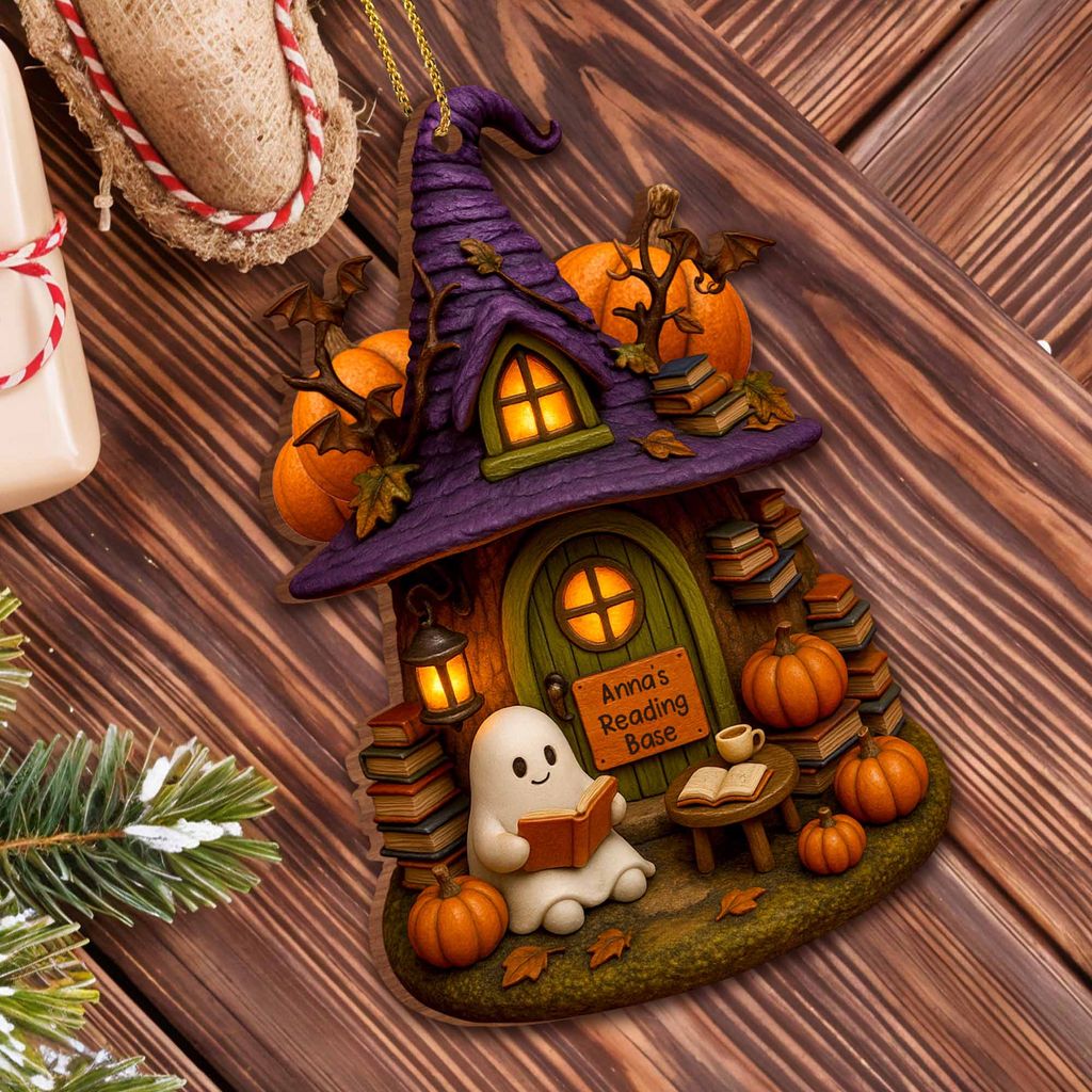 - 1 x Cozy Witch Hat And Ghost Reading - Personalized Custom Wood Ornament, Custom Shaped