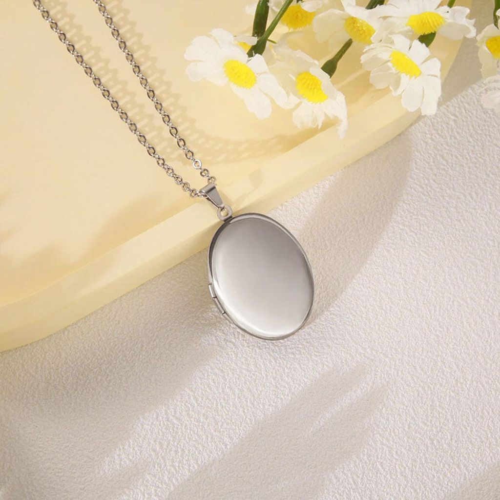 This personalized oval photo box necklace is made of mirror-polished stainless steel, with a smooth mirror-like surface, elegant and generous. The photo box can be opened, with a precious photo inside, and supports engraving, so that you can carry the memories with you, which is a deep memory of lovers and relatives.