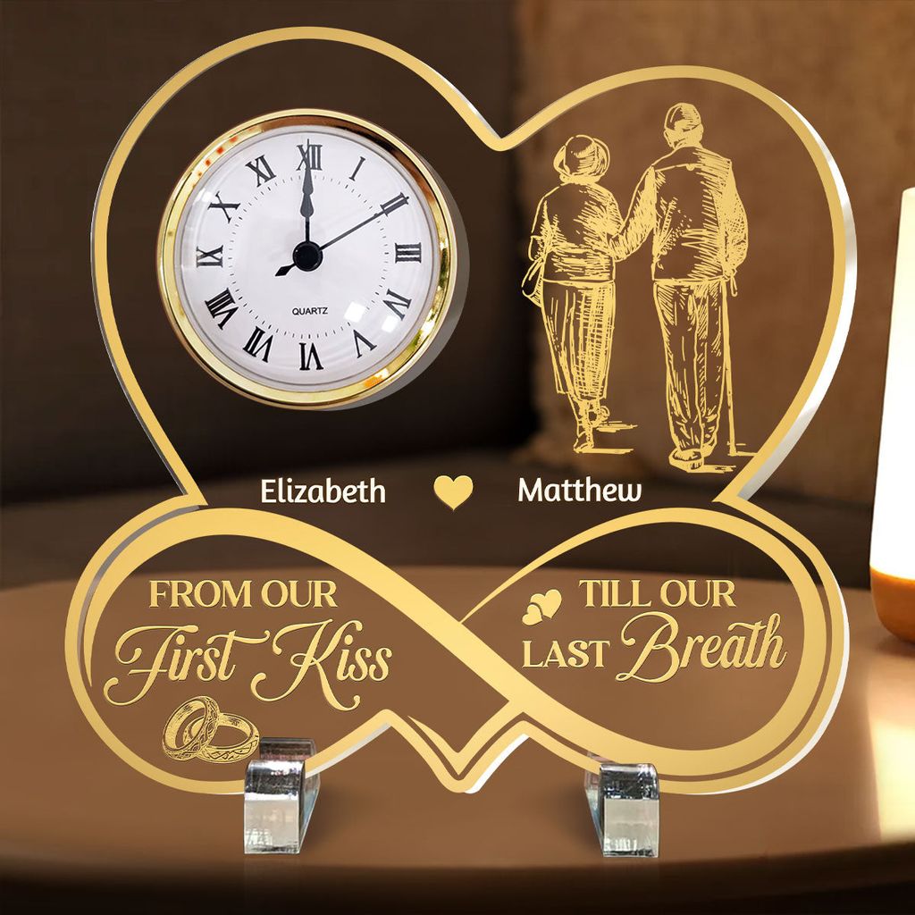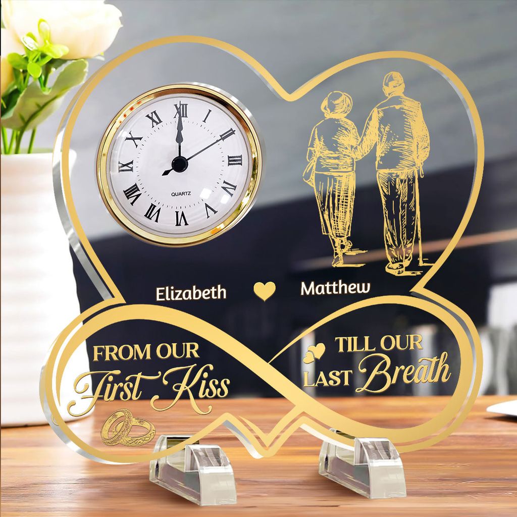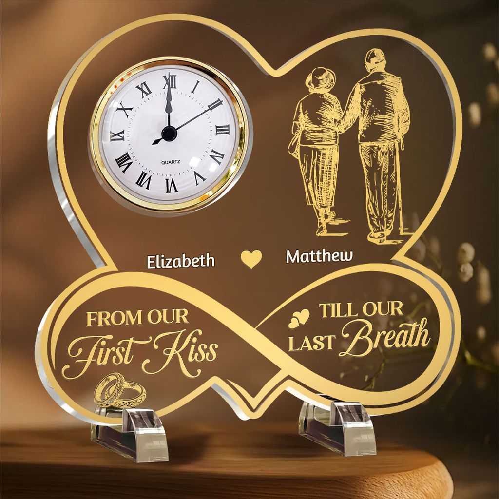 Whether it’s for a milestone anniversary, a retirement, or a heartfelt tribute to a lifelong love, this clock becomes more than acrylic and gold — it becomes a keepsake of the decades shared, the memories made, and the love that only deepens with time.Add your names and the words “From our first kiss till our last breath,” and it becomes a piece that’s as timeless as your journey.