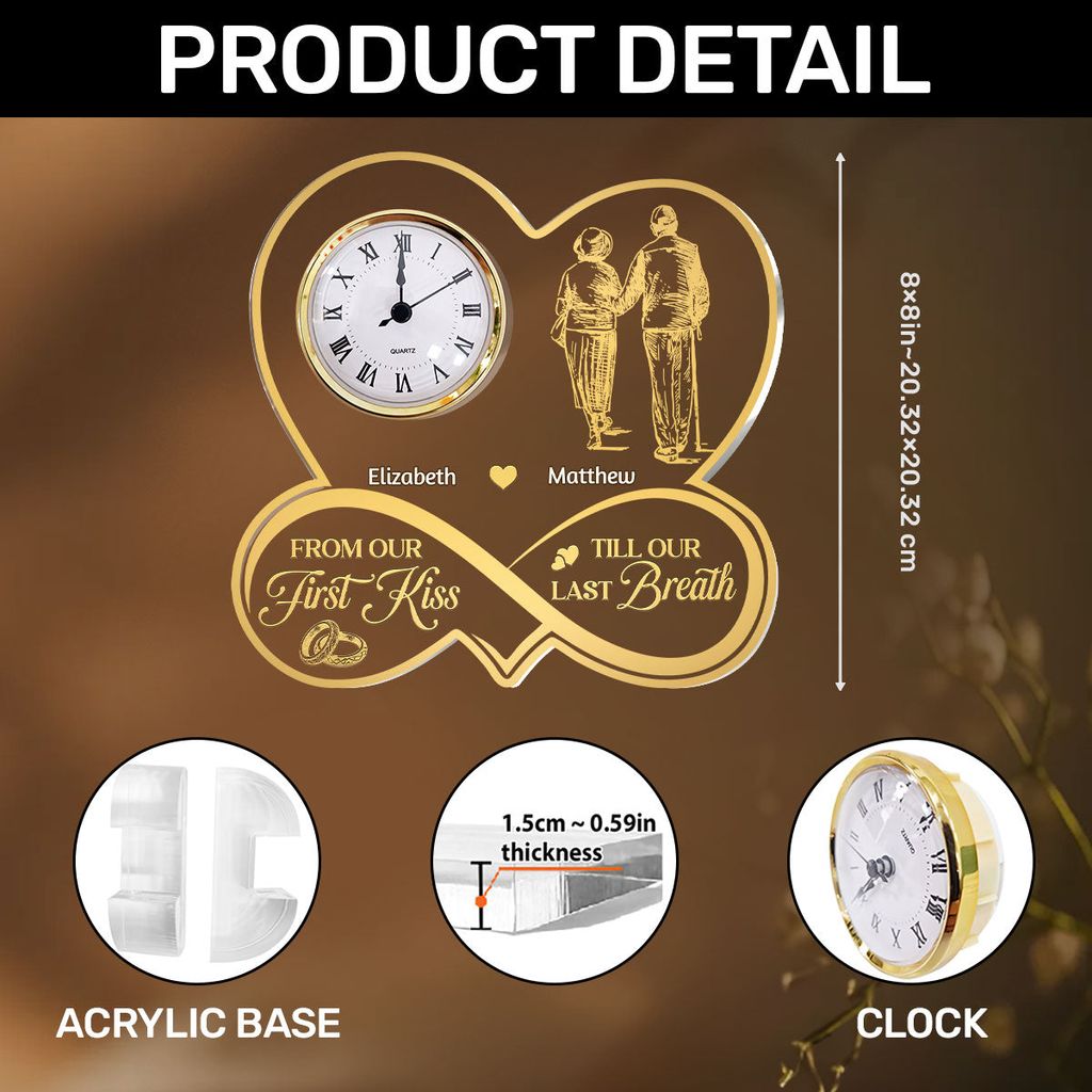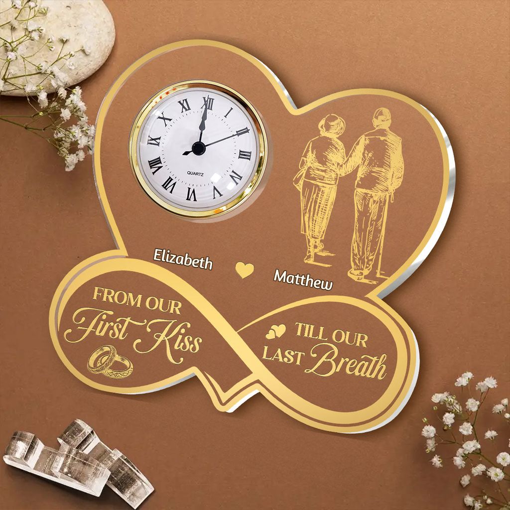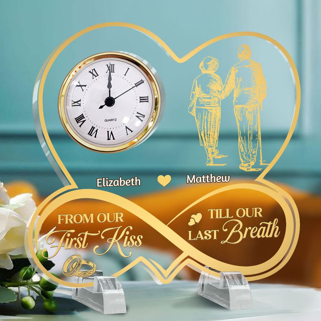 Whether it’s for a milestone anniversary, a retirement, or a heartfelt tribute to a lifelong love, this clock becomes more than acrylic and gold — it becomes a keepsake of the decades shared, the memories made, and the love that only deepens with time.Add your names and the words “From our first kiss till our last breath,” and it becomes a piece that’s as timeless as your journey.