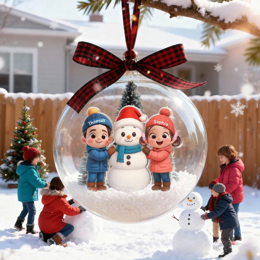 Capture the holiday spirit with a snowy scene of bundled-up kids by a cheerful snowman, framed by evergreens and a festive plaid bow. The clear globe looks crisp from every angle and adds a gentle sparkle among the lights, delivering a fun decoration that instantly lifts the festive atmosphere.