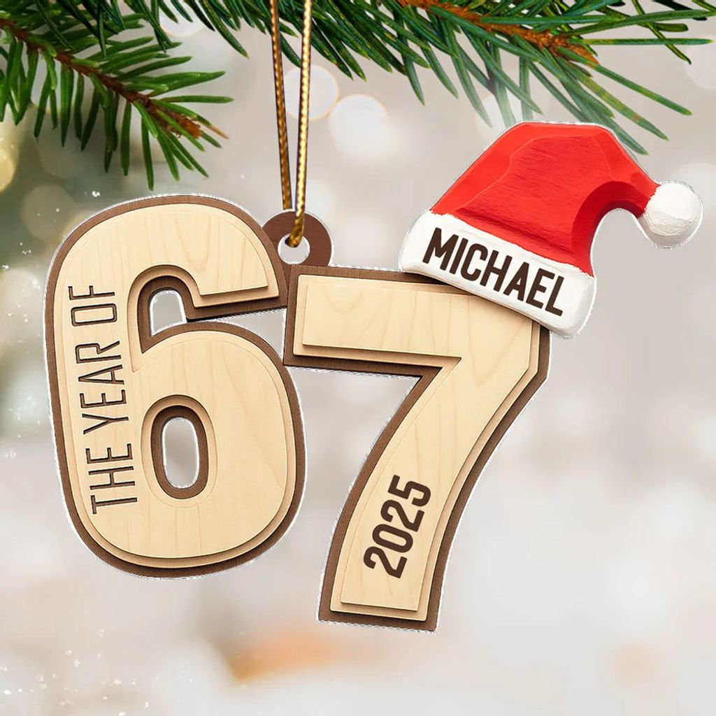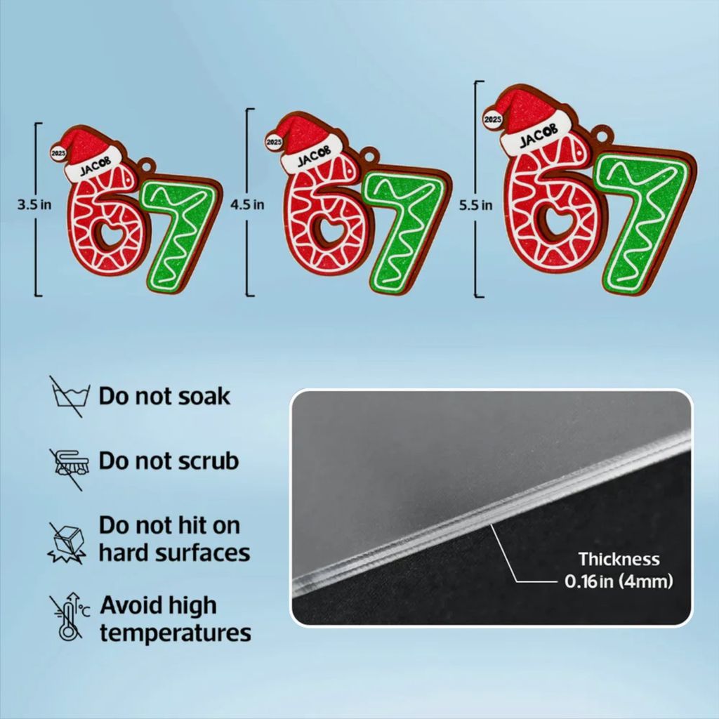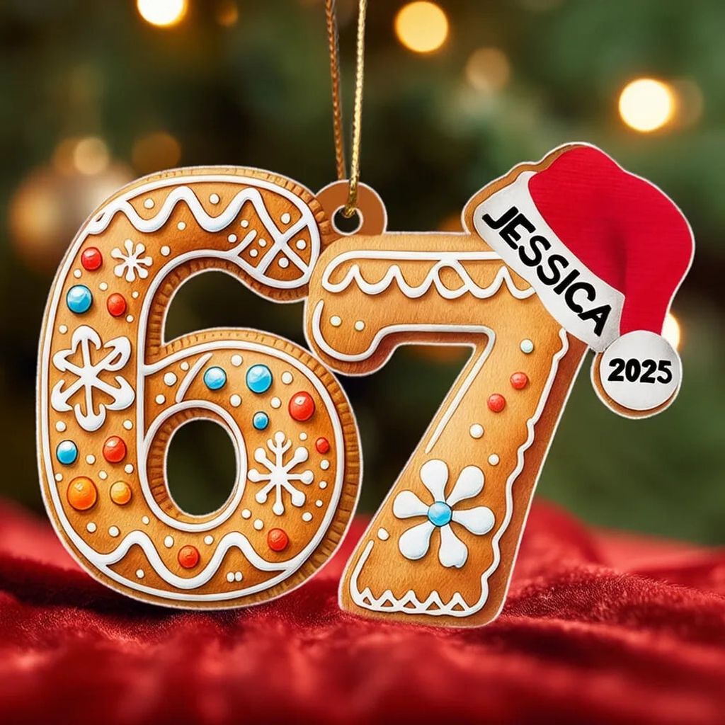 Warm cookie tones, white icing swirls, and pops of red and blue give this ornament a cozy, straight from the oven gingerbread look. The 67 shape is topped with a bright red Santa hat for an extra festive touch that feels playful and modern, just like teen slang and inside jokes. Hung among twinkling lights and evergreen branches, it creates that cheerful, cozy holiday mood they will want to show off in every tree selfie.