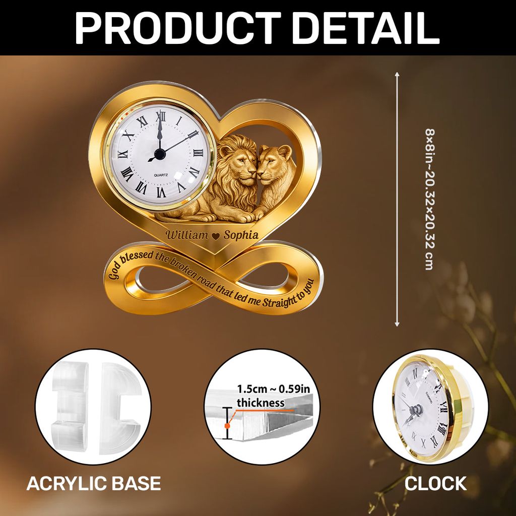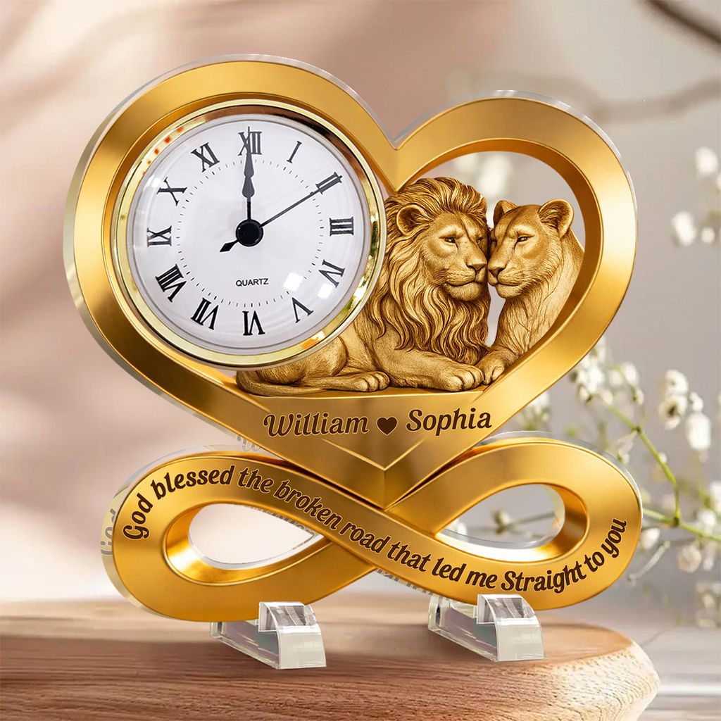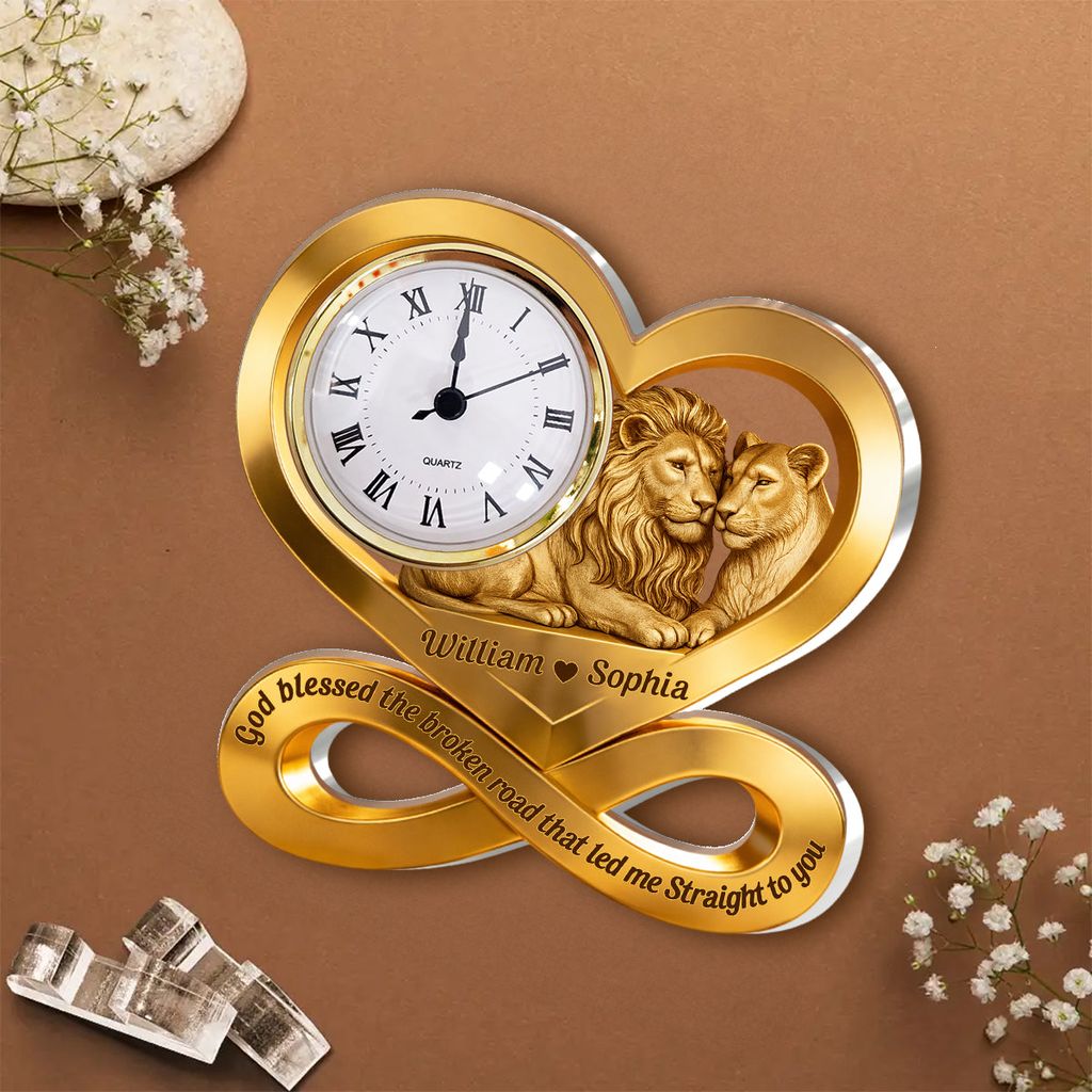 With the lion and lioness nestled at the heart, your names etched into the golden curve, and the words “God blessed the broken road that led me straight to you,” it turns every tick of the clock into a reminder that your love was written in the stars.
