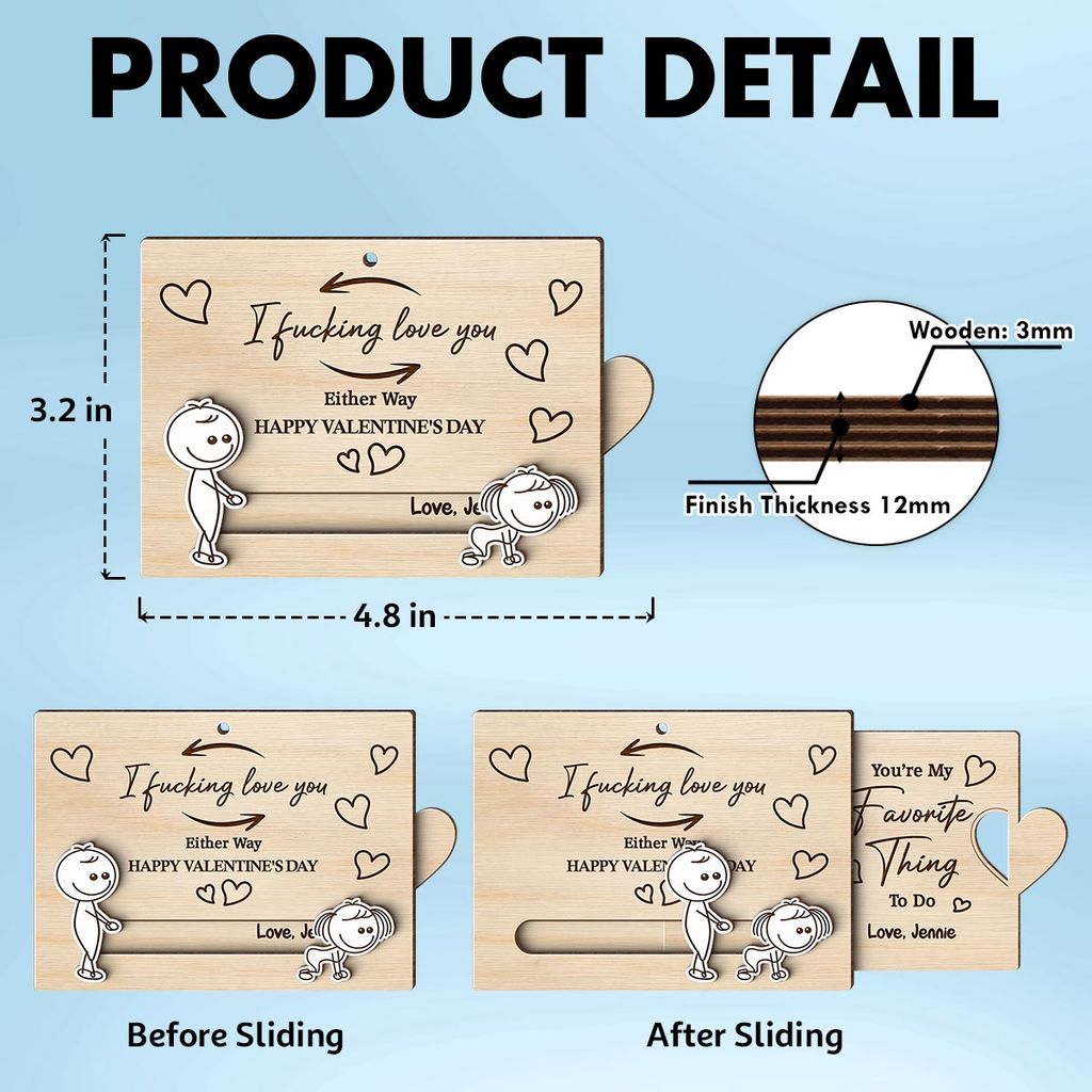 Make a bold, laugh-out-loud statement this Valentine’s Day with a cheeky keepsake that says exactly what you’re thinking. This personalized wooden slider ornament grabs attention with its playful, inappropriate message, builds interest through a fun interactive slider design, and creates desire by letting you customize names or a short message for a truly one-of-a-kind gift. Designed to be memorable and meaningful, it’s the perfect way to surprise your partner and turn a simple moment into a lasting memory—order now to make your love unmistakably clear.