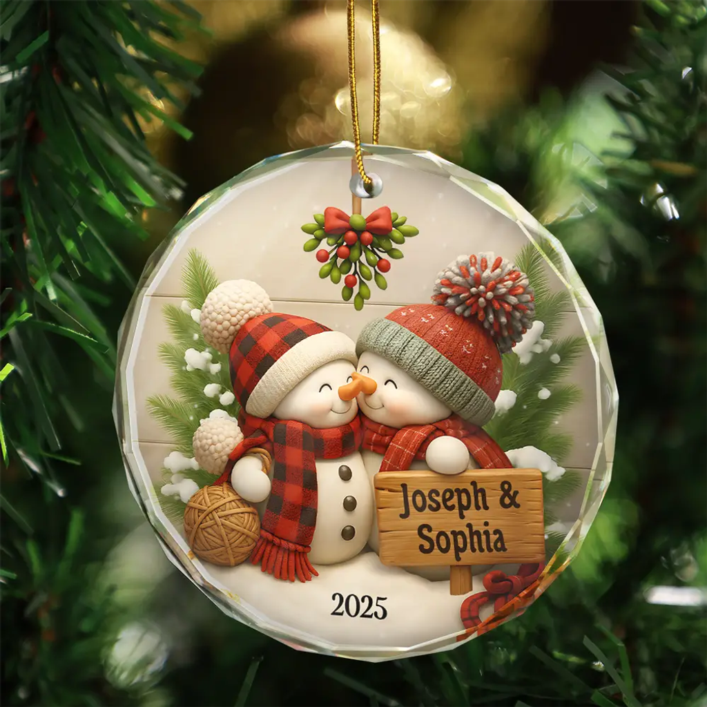 Celebrate romance with the Kissing Snowman Couple Christmas - Personalized Circle Glass Ornament, a timeless keepsake that captures the magic of love during the holiday season. Meticulously crafted from 100% clear glass with beveled edges, this solid glass exudes timeless elegance, catching and reflecting light beautifully to add a radiant touch to your Christmas tree, wreath, or mantel. The ornament’s beveled edges create a stunning prism effect, giving it a sophisticated, multi-dimensional appearance. The smooth, crystal-clear surface is perfect for customizing.